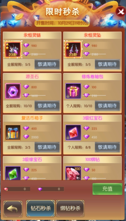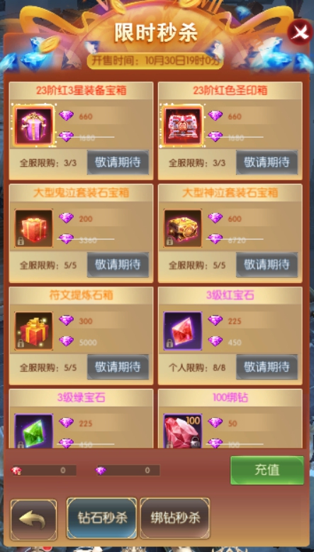 活动简介:活动期间,玩家能以超低的价格秒杀原价道具,机会不容错过。