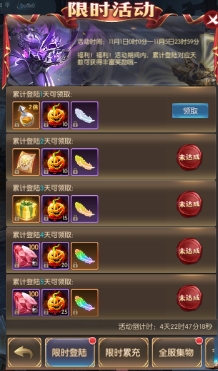 累计登陆5天 | 100绑钻,万圣南瓜*25,神圣之羽 |