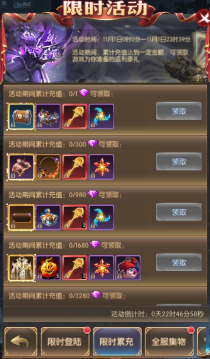 累计充值980钻 | 南瓜先生气泡,万圣南瓜*5/紫色魂饰宝箱*1,自适应寻宝钥匙*2,自然之灵 |