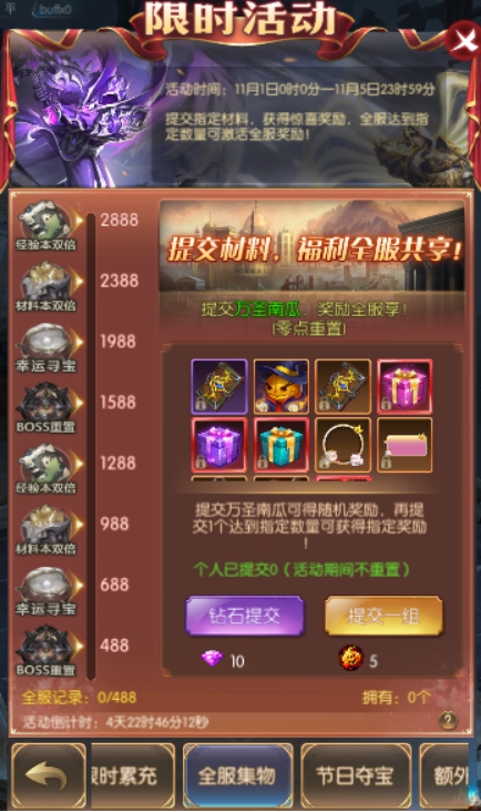 绑钻*20 | 万圣南瓜*5 | 绑钻*100 | 源圣石 | 10 | 30 | 60 | 100 |