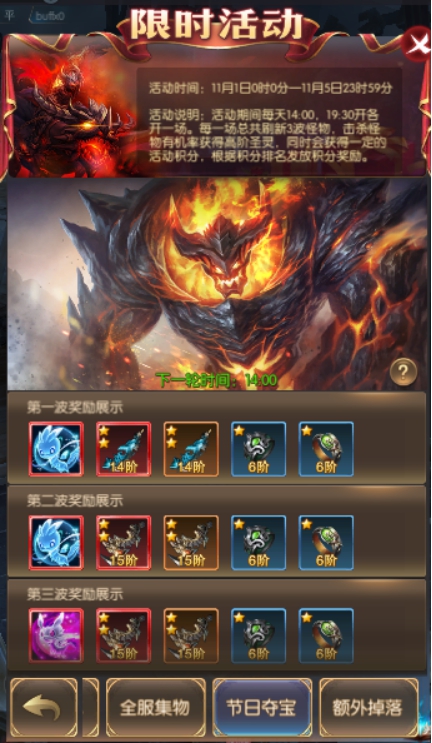 活动简介:活动期间每天14:00,19:30开各开一场。每一场总共刷新3波怪物,击杀怪物有获得高阶圣灵,同时会获得一定的活动积分,根据积分排名发放积分奖励。
