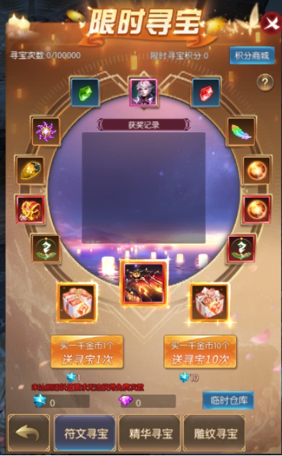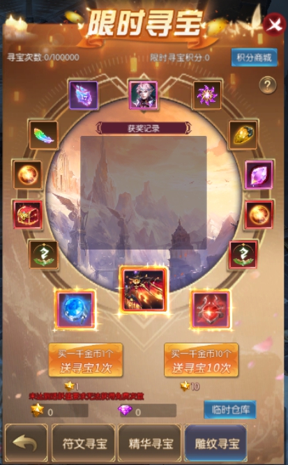 活动简介:进行寻宝即可获得丰厚奖励;限时寻宝时获得的积分,可在限时寻宝积分商城兑换珍稀道具,仅在限时寻宝开启时可使用,本次开启未用完的积分会保持到下次开启依旧可以使用