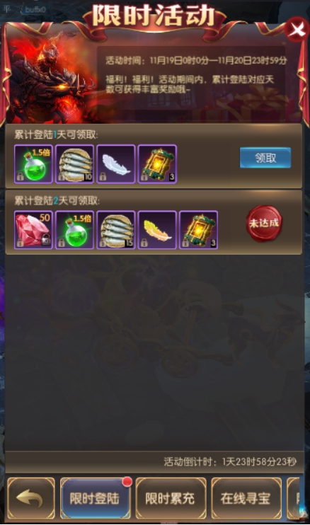 活动简介:福利!福利!活动期间内,累计登陆对应天数可获得丰富奖励哦~
