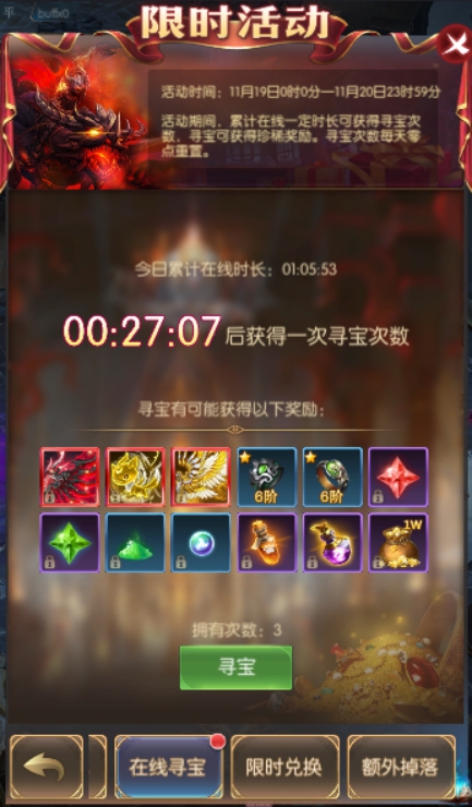 活动简介:活动期间,累计在线一定时常可获得寻宝次数,寻宝可获得珍稀奖励。寻宝次数每天零点重置。