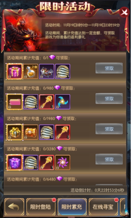 活动简介:活动期间,累计充值达到一定金额,可领取游戏为你准备的返利豪礼