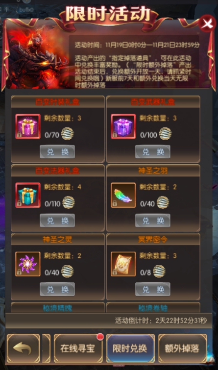 活动简介:活动期间,击杀250级以上世界boss、所有个人boss、冥界禁域、boss之家可额外掉落指定兑换道具,可在“限时兑换”活动中兑换丰富奖励;180级以上玩家野外挂机可额外掉落指定兑换道具,可在“限时兑换”活动中兑换丰富奖励