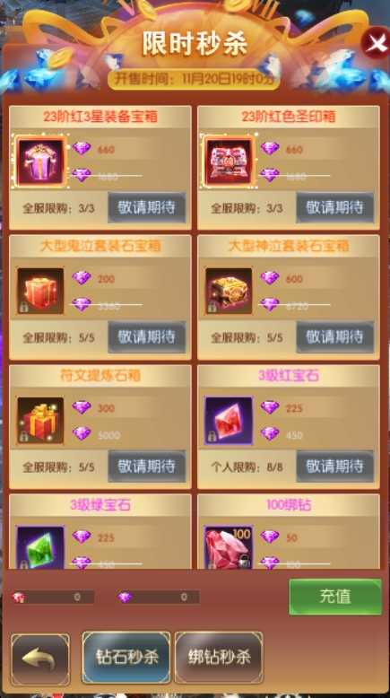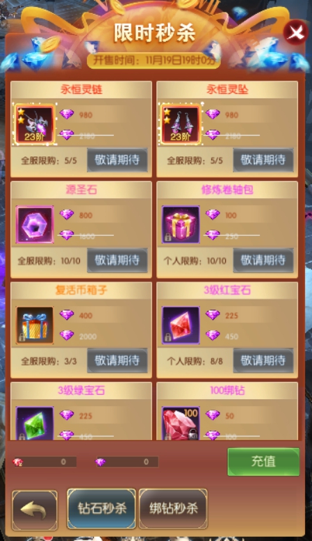 活动简介:活动期间,玩家能以超低的价格秒杀原价道具,机会不容错过。