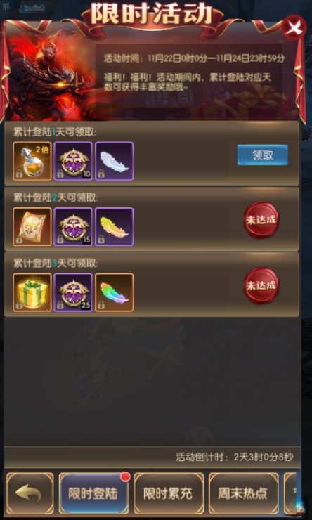 累计登陆3天 | 疲劳礼盒,热点*25,神圣之羽 |