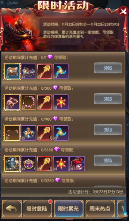 活动简介:活动期间,累计充值达到一定金额,可领取游戏为你准备的返利豪礼