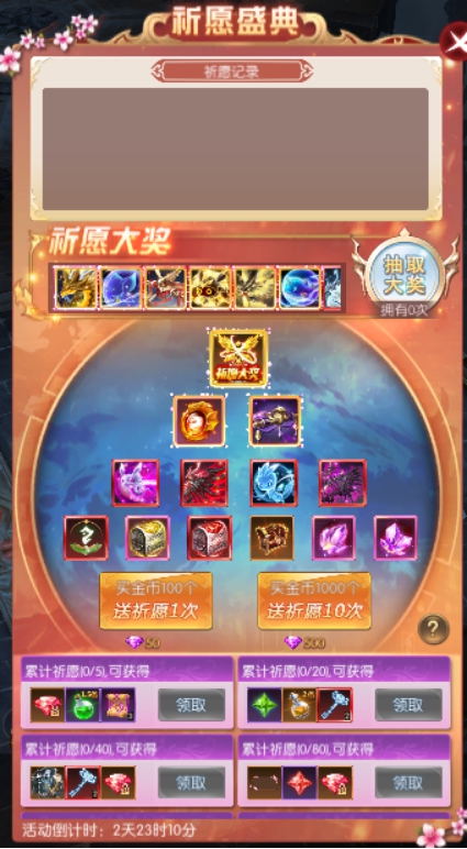 活动简介:活动期间可以消耗钻石购买金币进行祈愿,每次购买会赠送一个祈愿奖励 ;在奖池中抽到祈愿盛典大奖后,可在上方祈愿大奖奖池中抽取一次极品奖励(必然获得奖池中的极品奖励之一) ;祈愿达到累计次数可以获得对应的次数奖励,奖励多多 ;活动期间祈愿累计次数不会重置,活动结束后重置