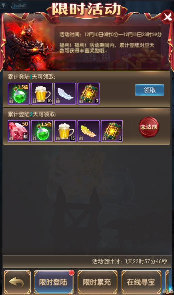 活动简介:福利!福利!活动期间内,累计登陆对应天数可获得丰富奖励哦~