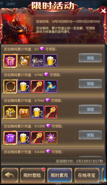 活动简介:活动期间,累计充值达到一定金额,可领取游戏为你准备的返利豪礼
