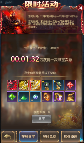 活动简介:活动期间,累计在线一定时常可获得寻宝次数,寻宝可获得珍稀奖励。寻宝次数每天零点重置。