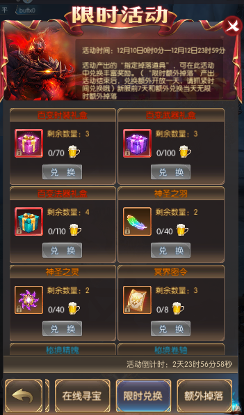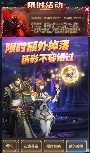 活动简介:活动期间,击杀250级以上世界boss、所有个人boss、冥界禁域、boss之家可额外掉落指定兑换道具,可在“限时兑换”活动中兑换丰富奖励;180级以上玩家野外挂机可额外掉落指定兑换道具,可在“限时兑换”活动中兑换丰富奖励