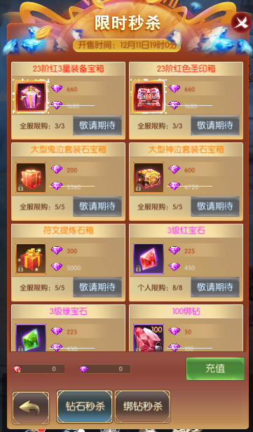 活动简介:活动期间,玩家能以超低的价格秒杀原价道具,机会不容错过。