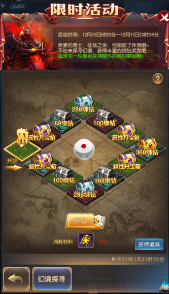 3.投骰子需要消耗幻境探寻道具。幻境探寻道具会通过钻石商城购买、累充和限时兑换获得。