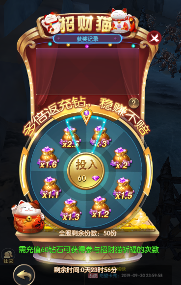 2.每个档位的招财猫每位玩家只能参与一次,并且全服有一定的参与份数总数,以上两个份数任意一个被买完则会自动进入下一档