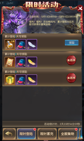 活动简介:福利!福利!活动期间内,累计登陆对应天数可获得丰富奖励哦~