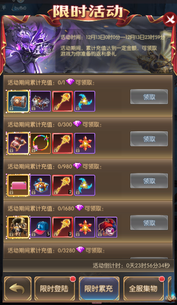 活动简介:活动期间,累计充值达到一定金额,可领取游戏为你准备的返利豪礼