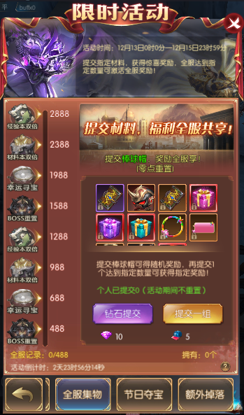 活动简介:提交指定材料,获得惊喜奖励,全服达到指定数量可激活全服奖励!