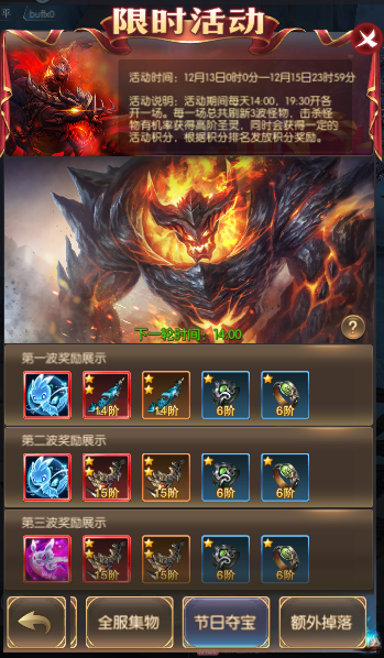 活动简介:活动期间每天14:00,19:30开各开一场。每一场总共刷新3波怪物,击杀怪物有获得高阶圣灵,同时会获得一定的活动积分,根据积分排名发放积分奖励。