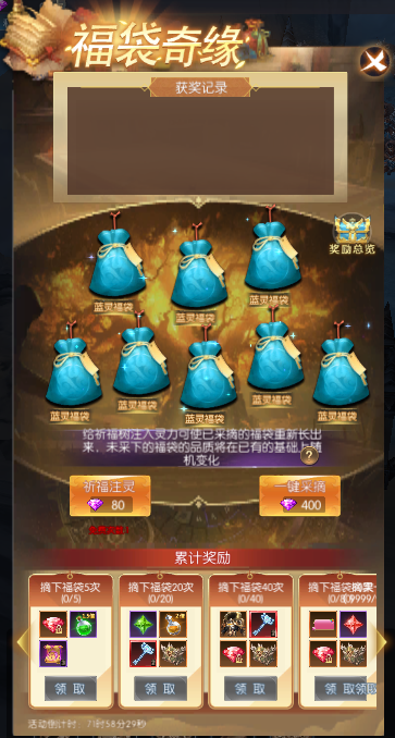 1.点击祈福树上的福袋可以采下福袋,获得对应的奖励