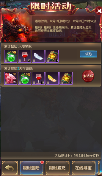 活动简介:福利!福利!活动期间内,累计登陆对应天数可获得丰富奖励哦~