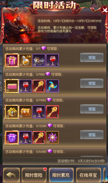 活动简介:活动期间,累计充值达到一定金额,可领取游戏为你准备的返利豪礼