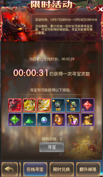 活动简介:活动期间,累计在线一定时常可获得寻宝次数,寻宝可获得珍稀奖励。寻宝次数每天零点重置。