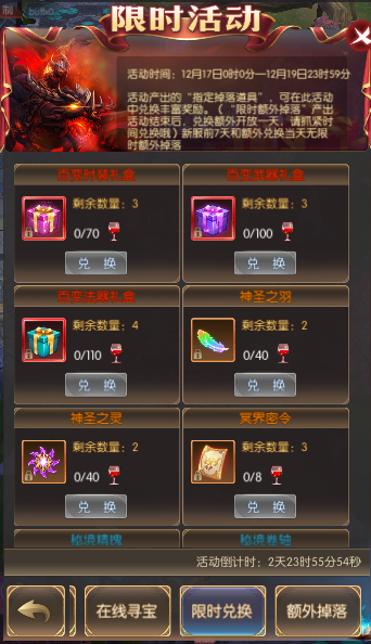 活动简介:活动期间,击杀250级以上世界boss、所有个人boss、冥界禁域、boss之家可额外掉落指定兑换道具,可在“限时兑换”活动中兑换丰富奖励;180级以上玩家野外挂机可额外掉落指定兑换道具,可在“限时兑换”活动中兑换丰富奖励