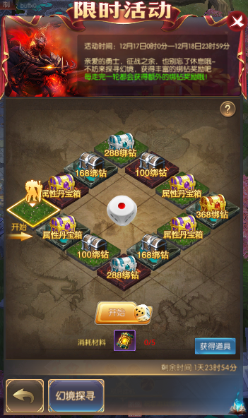 3.投骰子需要消耗幻境探寻道具。幻境探寻道具会通过钻石商城购买、累充和限时兑换获得。