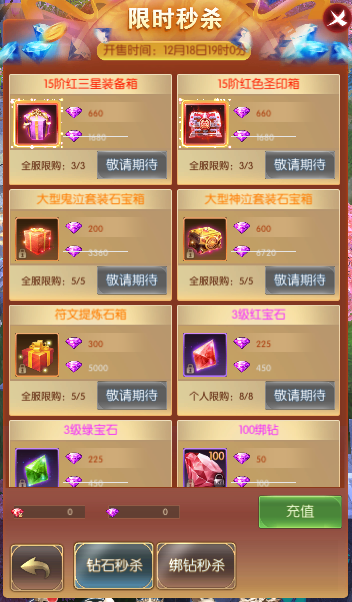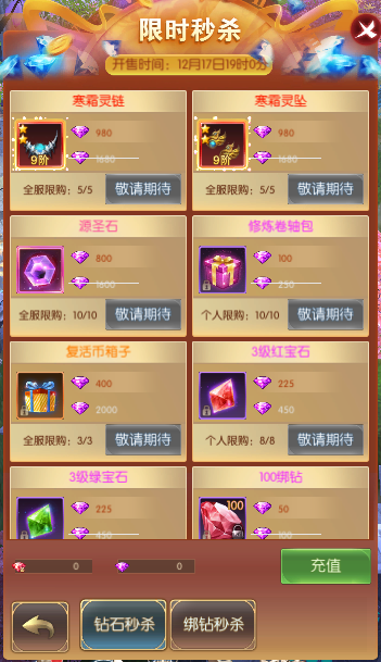 活动简介:活动期间,玩家能以超低的价格秒杀原价道具,机会不容错过。