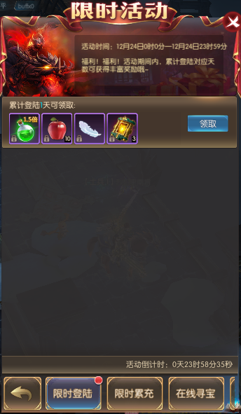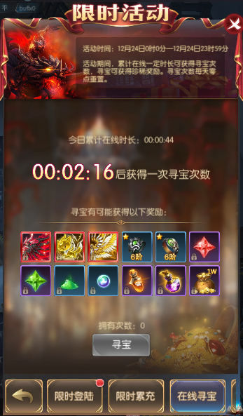 活动简介:活动期间,累计在线一定时常可获得寻宝次数,寻宝可获得珍稀奖励。寻宝次数每天零点重置。