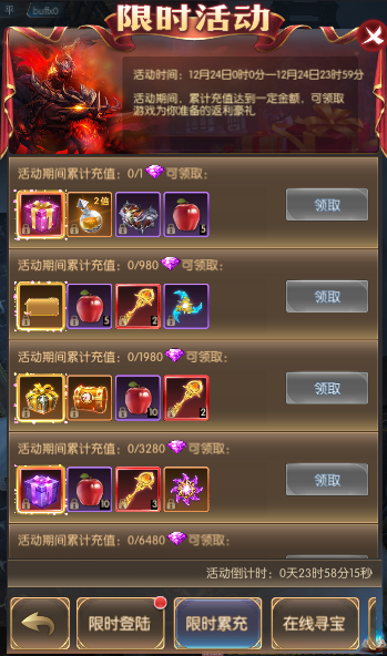 活动简介:活动期间,累计充值达到一定金额,可领取游戏为你准备的返利豪礼