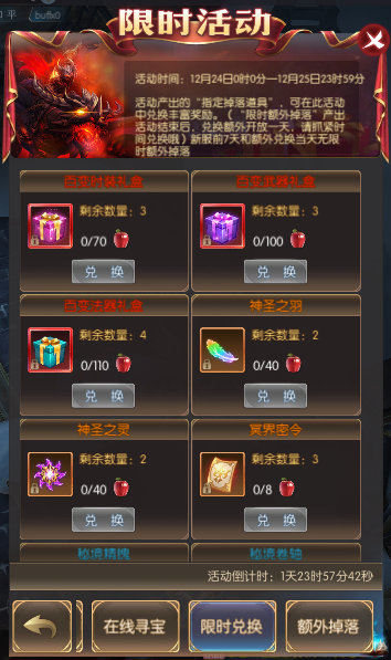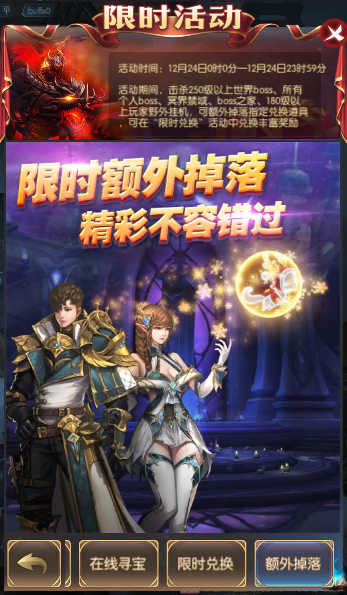 活动简介:活动期间,击杀250级以上世界boss、所有个人boss、冥界禁域、boss之家可额外掉落指定兑换道具,可在“限时兑换”活动中兑换丰富奖励;180级以上玩家野外挂机可额外掉落指定兑换道具,可在“限时兑换”活动中兑换丰富奖励