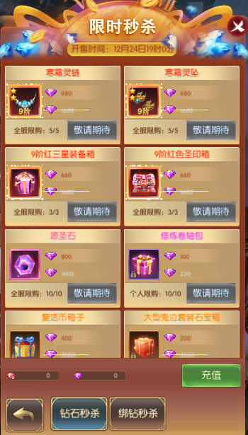 活动简介:活动期间,玩家能以超低的价格秒杀原价道具,机会不容错过。