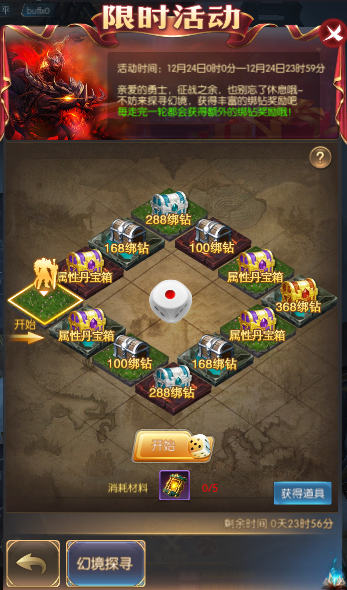 3.投骰子需要消耗幻境探寻道具。幻境探寻道具会通过钻石商城购买、累充和限时兑换获得。
