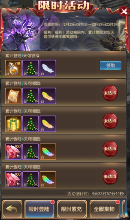 累计登陆4天 | 100绑钻,圣诞树*20,神圣之羽 |