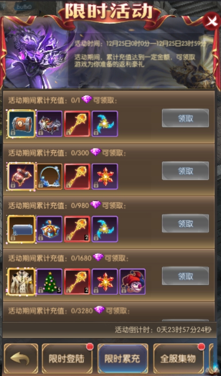 活动简介:活动期间,累计充值达到一定金额,可领取游戏为你准备的返利豪礼
