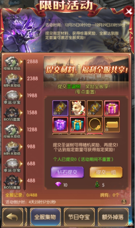 活动简介:提交指定材料,获得惊喜奖励,全服达到指定数量可激活全服奖励!