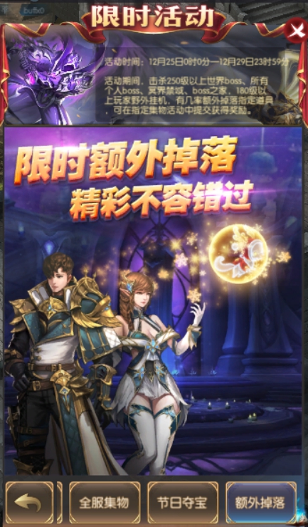 活动简介:活动期间,250级以上的世界boss,所有个人boss额外掉落贪图道具;250级以上世界boss、所有个人boss、冥界禁域、boss之家。180级以上玩家野外挂机有额外掉落指定道具,可在指定全服集物活动中提交获得奖励。