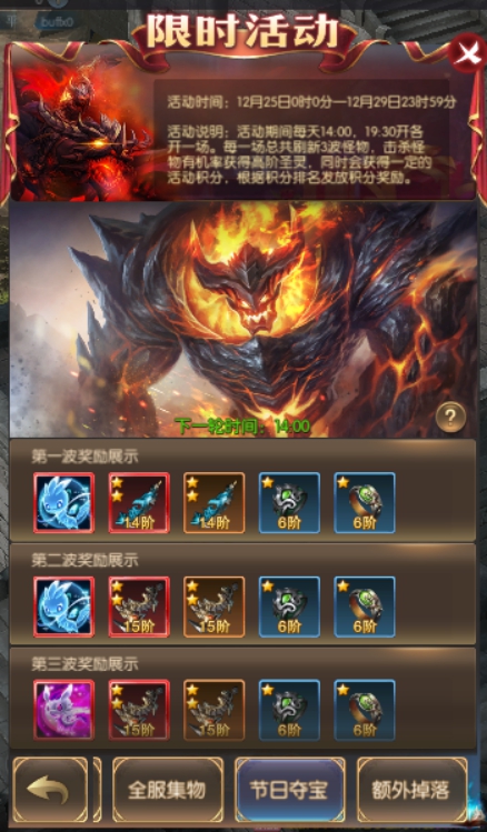 活动简介:活动期间每天14:00,19:30开各开一场。每一场总共刷新3波怪物,击杀怪物有获得高阶圣灵,同时会获得一定的活动积分,根据积分排名发放积分奖励。