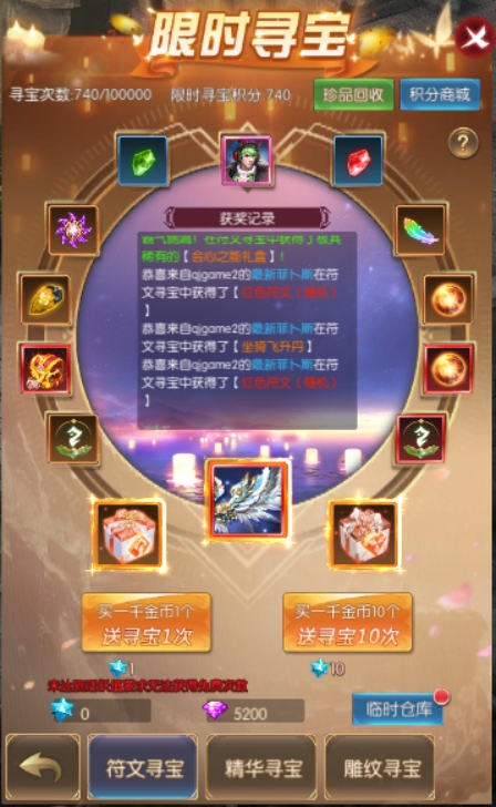 活动简介:进行寻宝即可获得丰厚奖励;限时寻宝时获得的积分,可在限时寻宝积分商城兑换珍稀道具,仅在限时寻宝开启时可使用,本次开启未用完的积分会保持到下次开启依旧可以使用