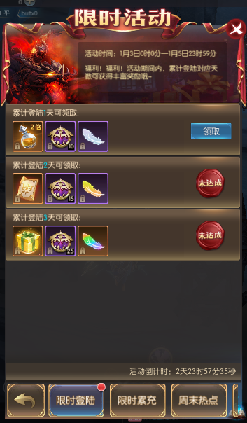 累计登陆3天 | 疲劳礼盒,热点*25,神圣之羽 |