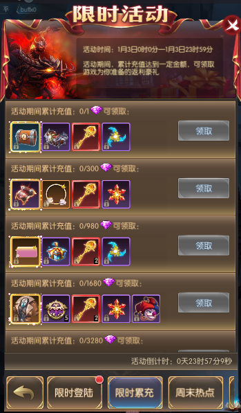 活动简介:活动期间,累计充值达到一定金额,可领取游戏为你准备的返利豪礼