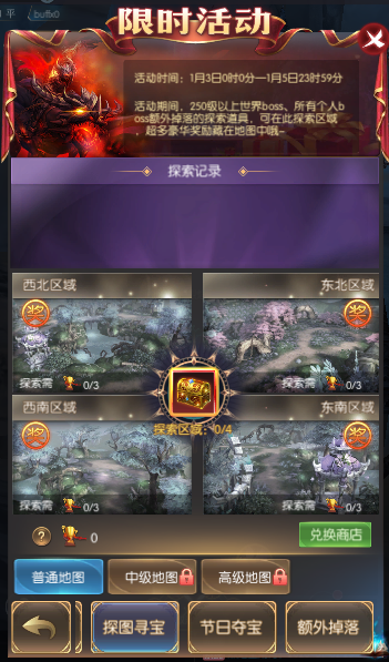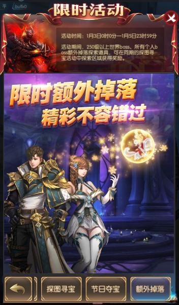 活动简介:活动期间,250级以上世界boss、所有个人boss额外掉落探索道具,可在同期的探图寻宝活动中探索区域获得奖励。