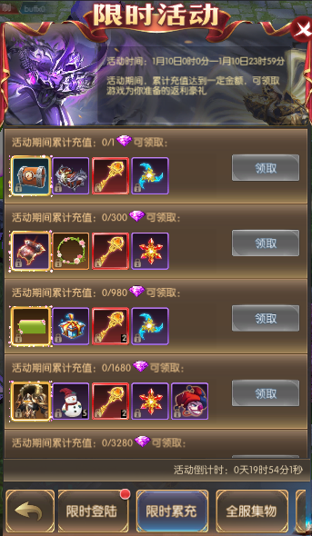 活动简介:活动期间,累计充值达到一定金额,可领取游戏为你准备的返利豪礼