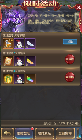 累计登陆3天 | 疲劳礼盒,小雪人*15,神圣之羽 |