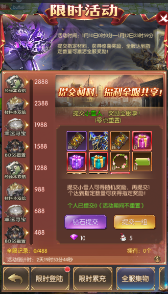 活动简介:提交指定材料,获得惊喜奖励,全服达到指定数量可激活全服奖励!