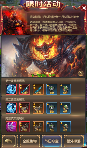 活动简介:活动期间每天14:00,19:30开各开一场。每一场总共刷新3波怪物,击杀怪物有获得高阶圣灵,同时会获得一定的活动积分,根据积分排名发放积分奖励。